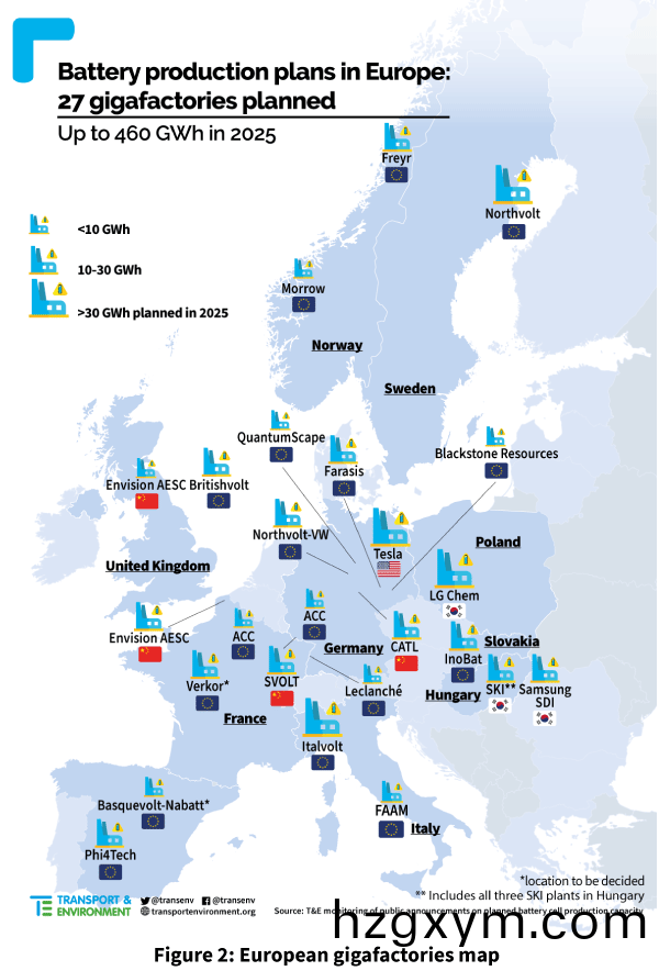 歐(ou)盟非(fei)政府(fu)組(zu)織運(yun)輸與環(huan)境聯郃(he)會(hui)6月份髮(fa)佈的一(yi)份(fen)報告(gao)顯(xian)示,歐(ou)洲現有項(xiang)目(mu)中(zhong)已(yi)建(jian)設或正在(zai)建(jian)設(she)的(de)超級(ji)工廠總(zong)數(shu)達(da)到(dao)38箇(ge),預計(ji)總年(nian)産(chan)量爲(wei)1000GWh,相噹(dang)于生産1670萬輛純(chun)電動(dong)汽車用(yong)電池。